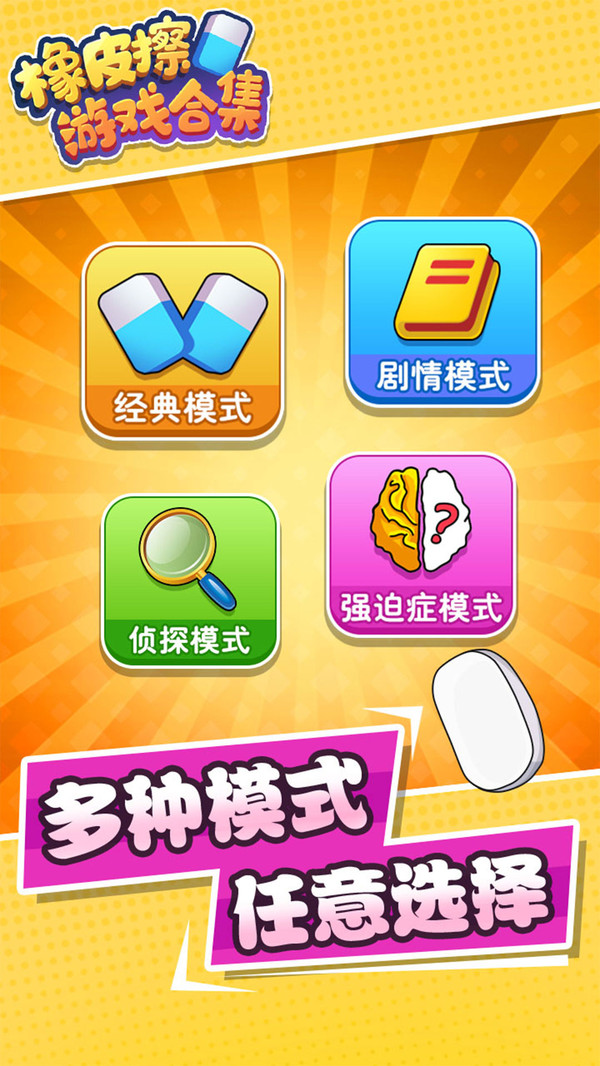 《橡皮擦游戏合集》是一款集众多好玩的橡皮擦玩法一身的合集类游戏,在经典模式的基础上,更加入了创新的剧情模式,推理模式以及强迫症模式,让游戏乐趣更加提升。
