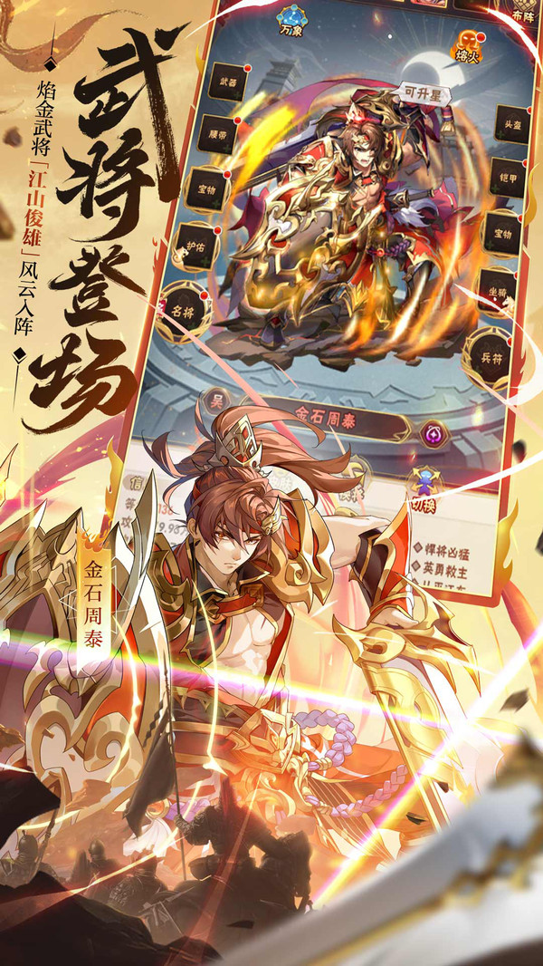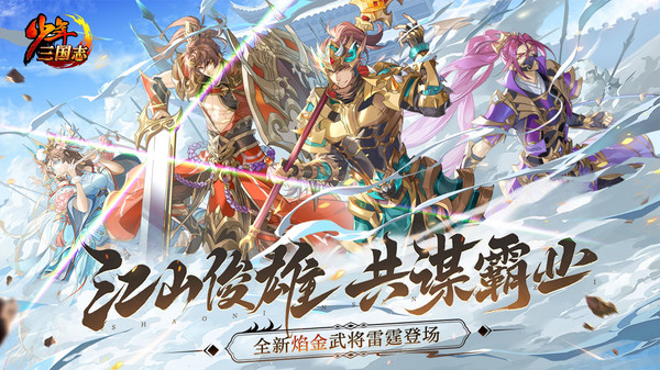 【武将登场 风云入阵】全新焰金武将「江山俊雄」降临三国!三国纷乱不休,沉睡的大地之力因势苏醒,燃烧了千万年的地底熔岩赋予了少年将军新的力量。第三代焰金武将灵变张郃,屠雄张飞,金石周泰,玉筝蔡文姬应运而出,将于10月1日雷霆登场!作为新一代焰金武将,四位武将各有所长,武将技能加入全新灼烧伤害和防御反击机制,不仅能助少年提升战力,更有多重强大技能破敌制胜!得此良将,少年定能一展宏图,成就一番霸业!