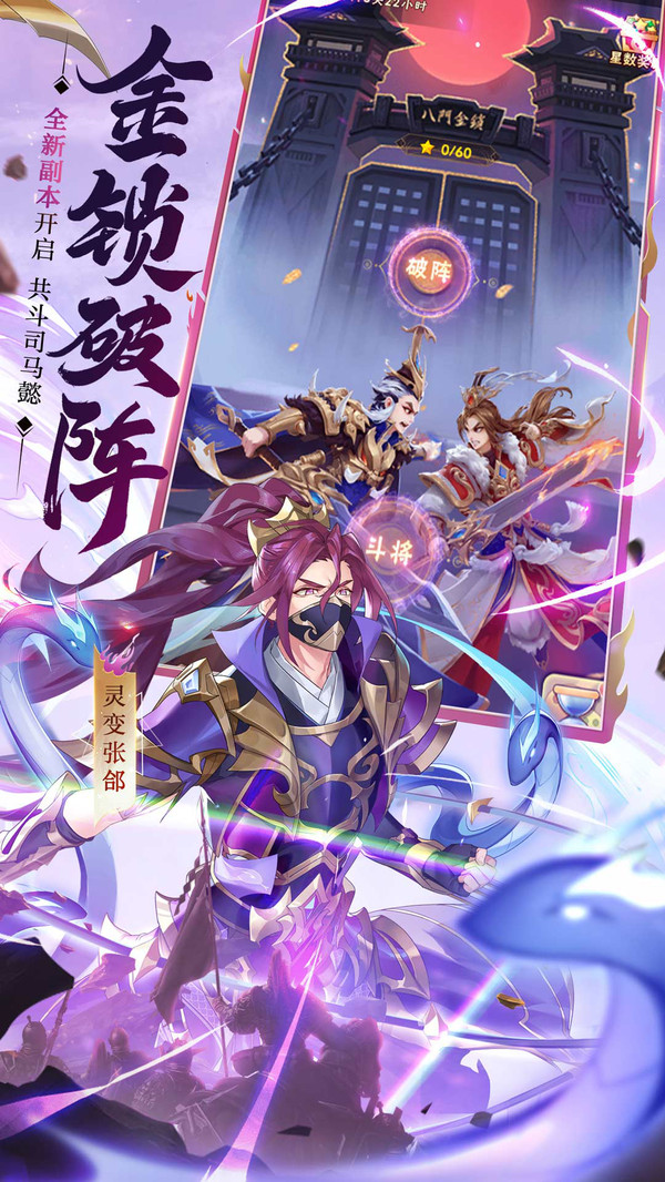 【金锁奇阵 齐心破之】魔化后的司马懿设下八门金锁阵,少年将与诸葛军师同行,破阵解救司马懿!金锁阵内机关重重,少年可以挑战不同难度的金锁阵,选择越高难度的关卡,破阵后可获得的奖励也会随之提升!少年可根据阵法特点,搭配不同阵容,排兵布阵,扭转乾坤,突出重围!