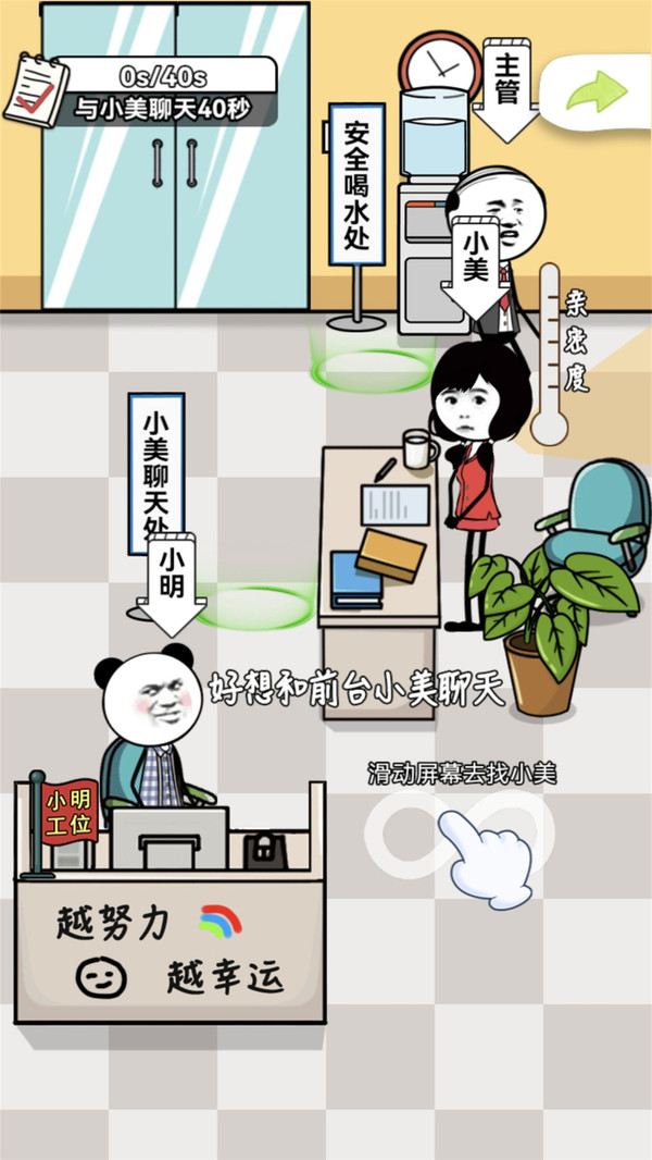 《公司摸鱼王》是一款奇葩搞怪小游戏,玩家需要扮演一名公司职员,小偷小摸的进行地下摸鱼行动。还要不定时的拍老板马屁,来让自己提升奖金;浑水摸鱼的不二之选,超级有想法有操作力的小游戏,值得你来挑战一下!