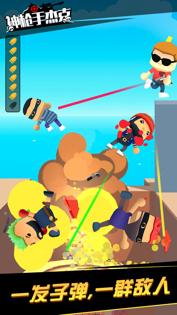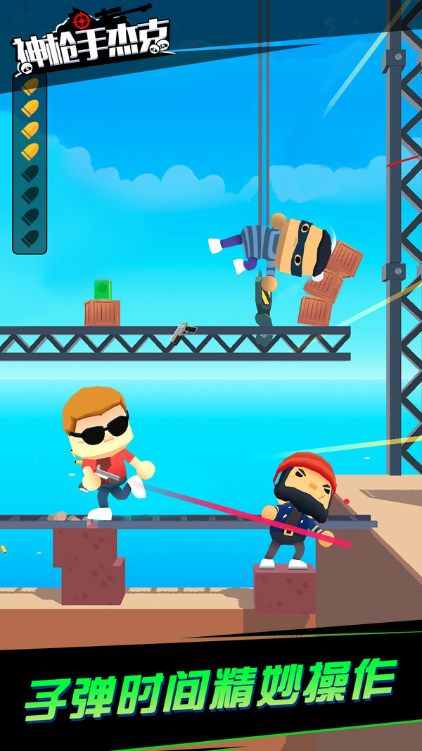 《神枪手杰克》是一款非常好玩的射击闯关游戏。在游戏中你将化身为神枪手杰克参与到这场别样的挑战之中!每一个关卡的设计都不一样,如果你想从劫匪手中将人质安然夺回的话,就要利用整个场景用你的枪支将他们一次性消灭,快来试试看吧~