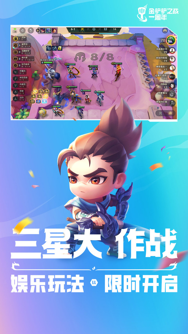 《金铲铲之战》是英雄联盟云顶之弈正版授权的自动战斗品类手游,每局比赛由八名玩家共同进行一场各自为战的博弈对抗,玩家通过招兵买马,融合英雄,提升战力,排兵布阵,成为最终立于战场上的赢家。 除了延续经典的玩法之外,还加入了快速模式、双人模式及阵容挑战赛等更多精彩内容,赶紧体验!