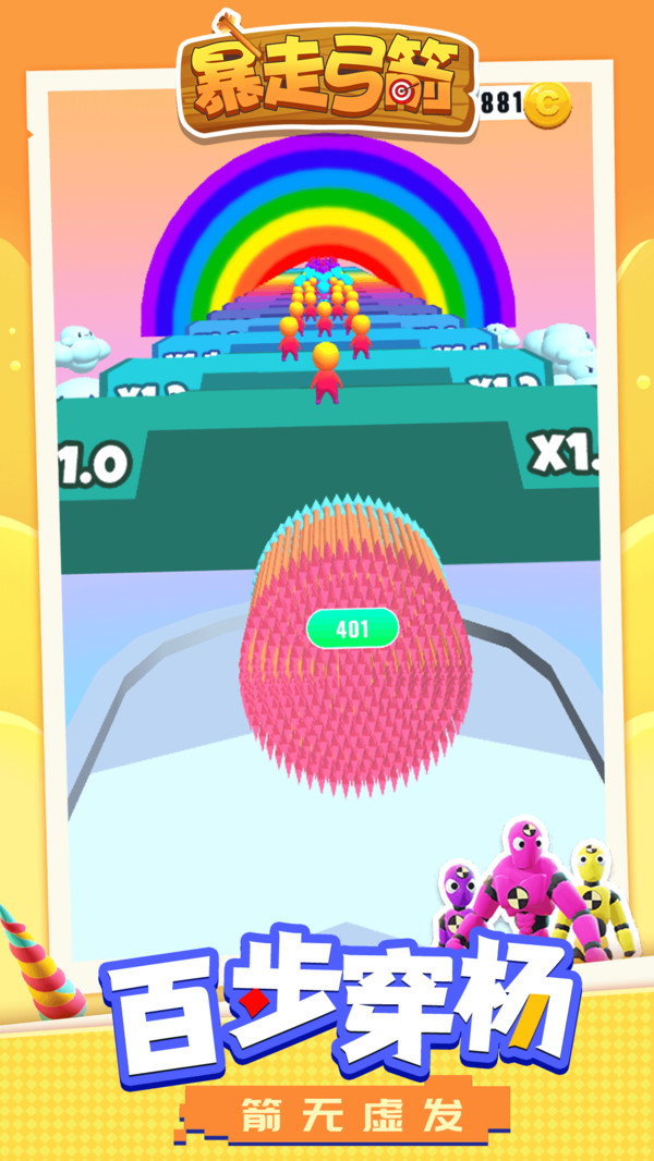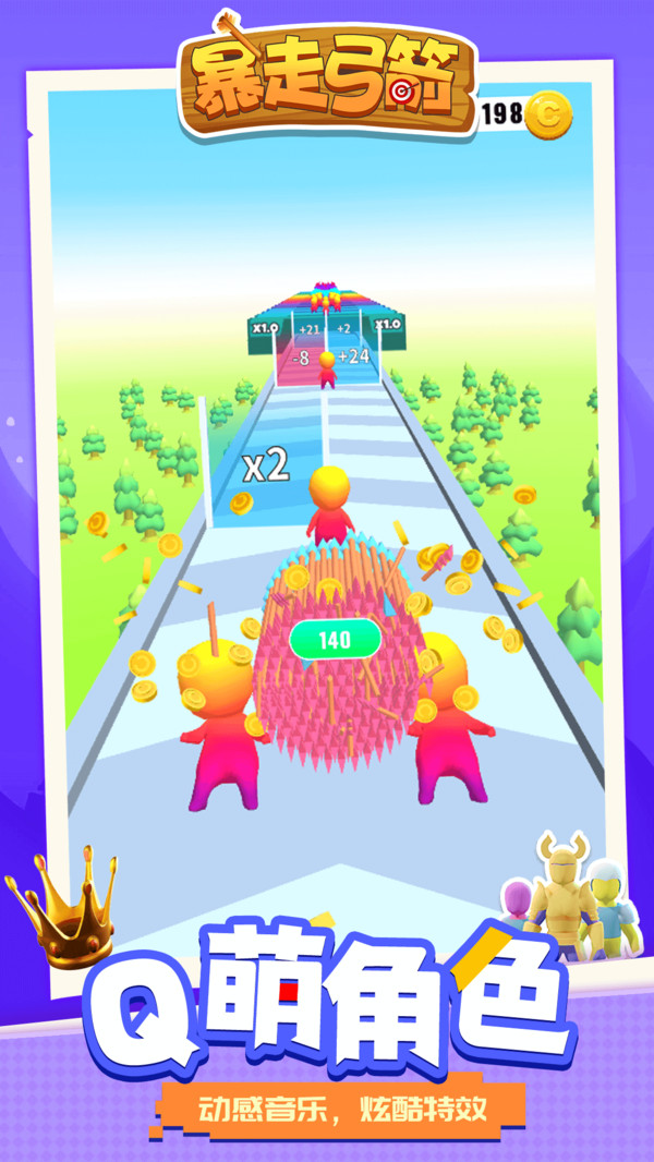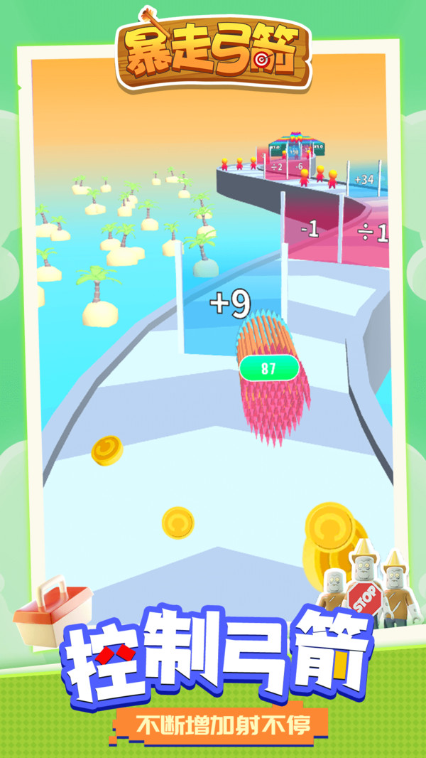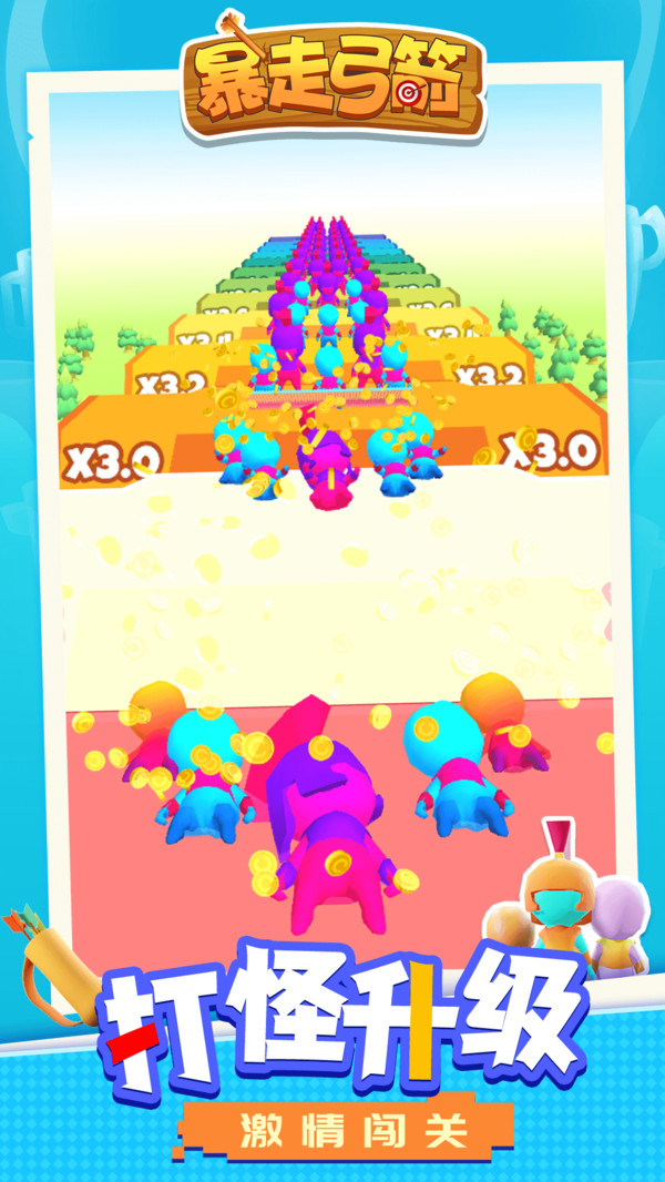 《暴走弓箭》是一款休闲射箭闯关游戏,玩家需要操控一只能自由飞行的弓箭,在赛道上穿过一道道标注数学算法的墙壁,让你的弓箭数量成倍增加,以便能顺利消灭掉挡路的敌人,并且尽可能的让弓箭的数量变得更多,在关卡的最后会有一大波敌人来阻挡你。