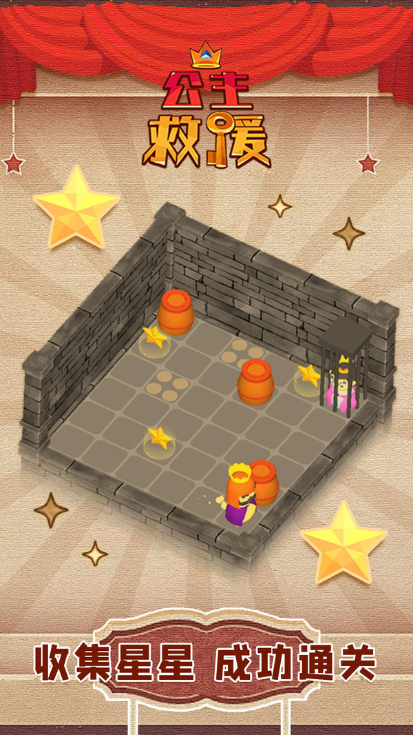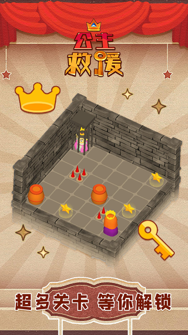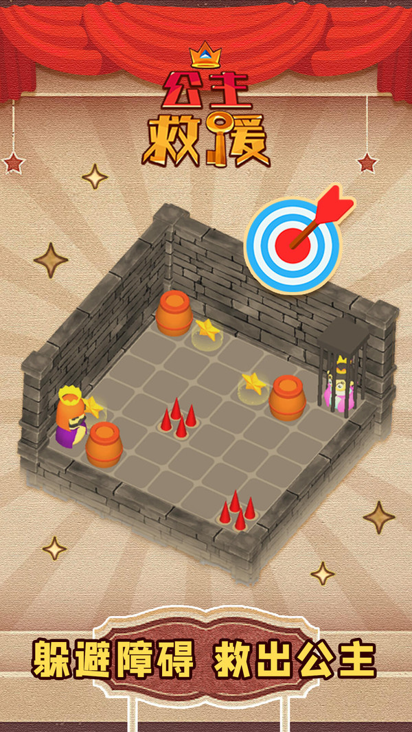 《公主救援》是一款有趣的休闲类手游,游戏中拥有非常丰富的游戏关卡供玩家闯关体验,在游戏中,玩家作为救援公主的国王,需要躲避障碍物,收集星星,通过合适的路径到达束缚住公主的铁笼面前,解救公主。救援的移动路径决定了能否成功将公主解救,要尽量避开凸起的地刺,在地刺藏匿起来时赶快前进,解救公主! 游戏特色: 1.游戏简单易上手,拖动国王移动躲避地刺及障碍物木桶,到达公主面前即可解救成功; 2.每个场景的障碍物和陷阱都是随机分布的,需要玩家灵活躲避,选择合适的路径前进,帮助国王解救公主。
