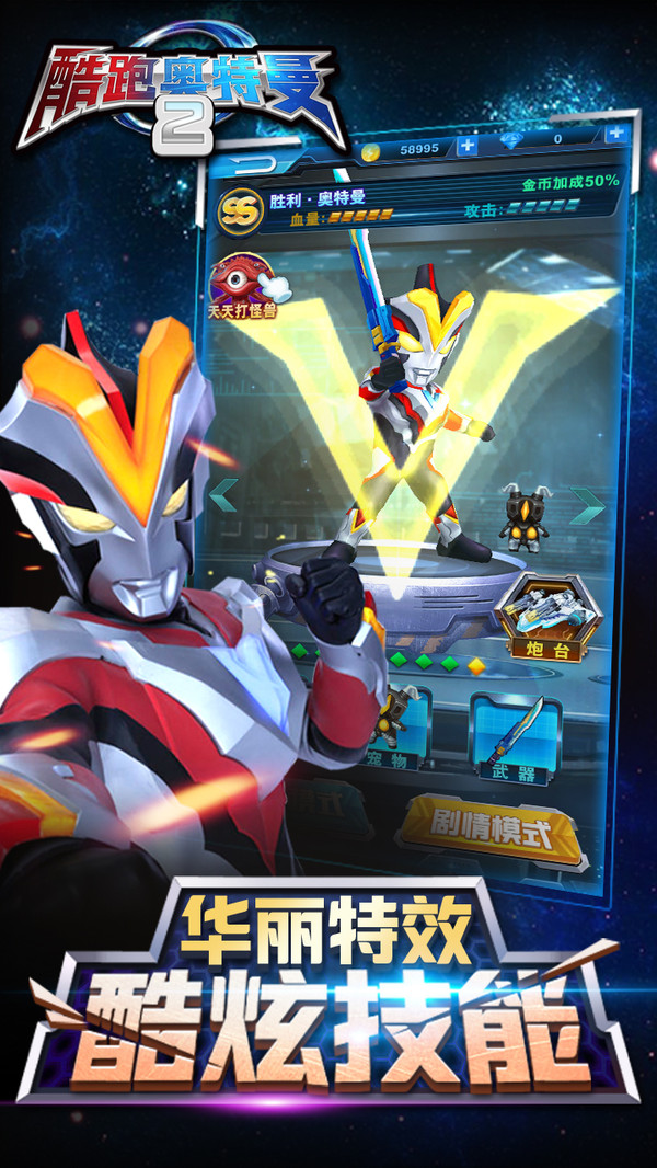 ★官方正版授权,经典形象再现 ★全新超越形态,闪耀震撼登场 ★组建奥特战队,迎战终极黑暗 “英雄集结 对抗黑暗” 2018超爽战斗跑酷游戏《酷跑奥特曼2》震撼来袭,无限连击体验华丽跑酷!玩家将在游戏中化身为梦比优斯、迪迦、艾克斯等一个个熟悉的奥特战士,对抗邪恶的怪兽军团,一起保卫我们的美好地球!快来集结你的奥特战队,迎战嚣张的巨大BOSS,引爆全新的奥特曼跑酷热潮! “多样关卡 乐趣无穷” 游戏中采用关卡冒险模式,每个关卡的设计都独具匠心,不同的奥特战士能在同一个关卡中体验到不同的