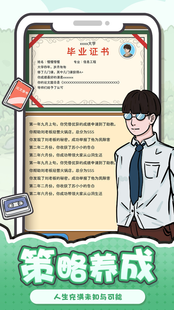 ——数十种结局的展开!游戏内置几十种结局,从世界富豪到流落街头……这一切都取决于你的大学生活。