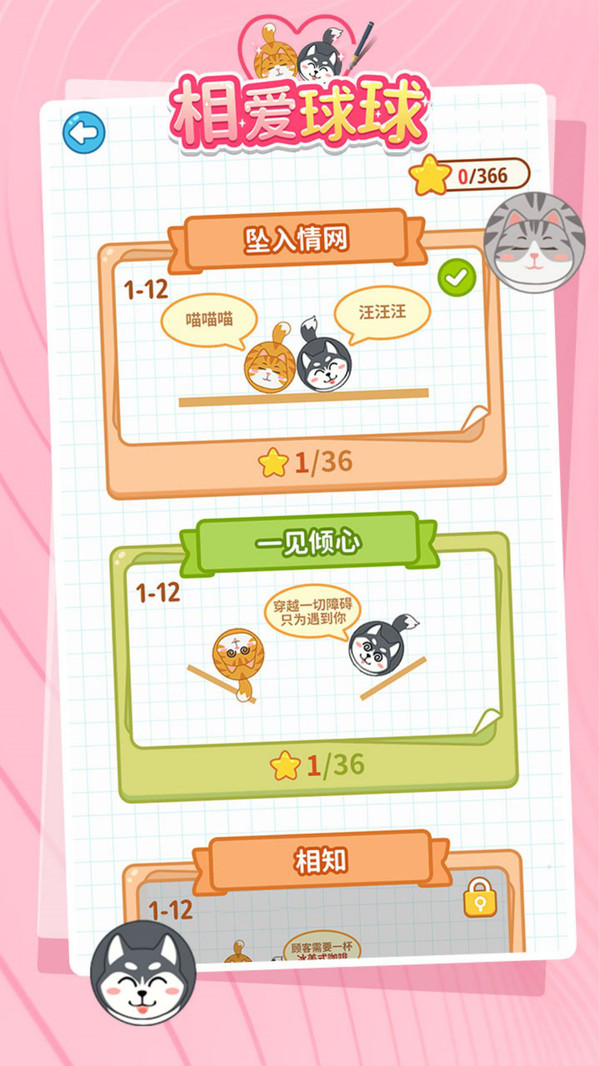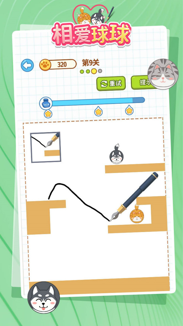 有两颗可爱的球球失散拉,需要你帮助他们相遇!《相爱球球》是一款智力向画线休闲小游戏,玩家要通过不同场景,让两颗萌萌的猫球和狗球相遇碰撞~一起来帮助球球相遇吧~