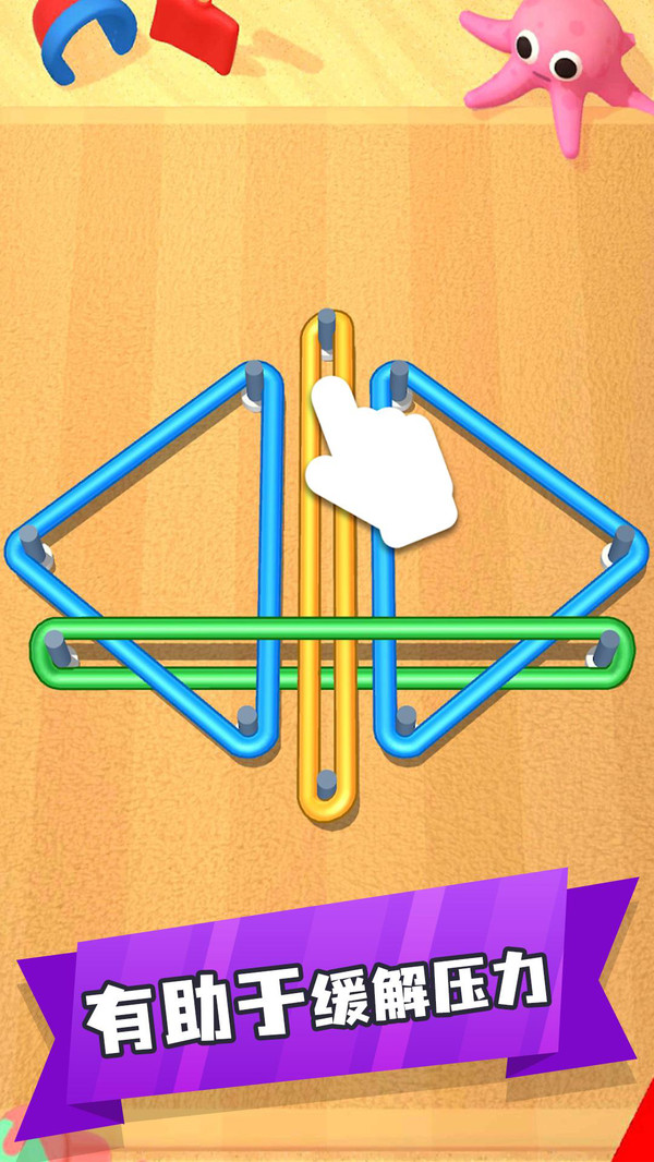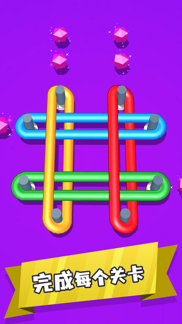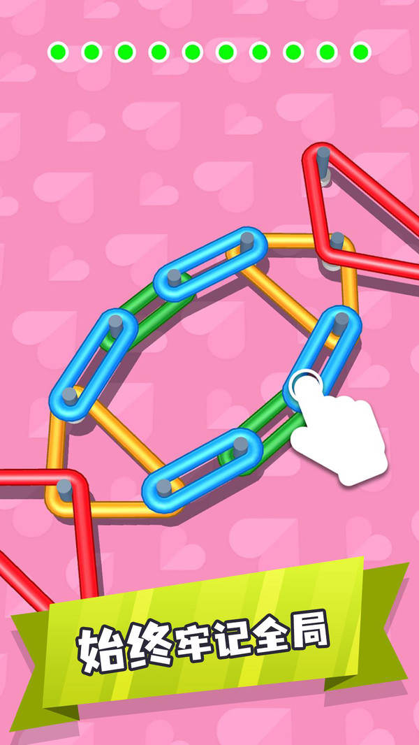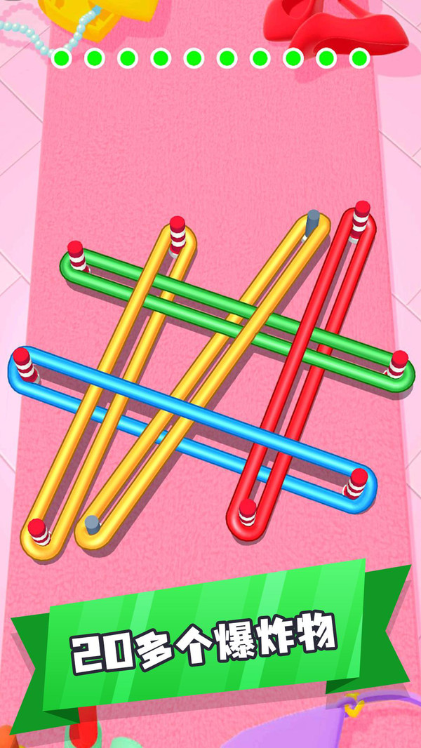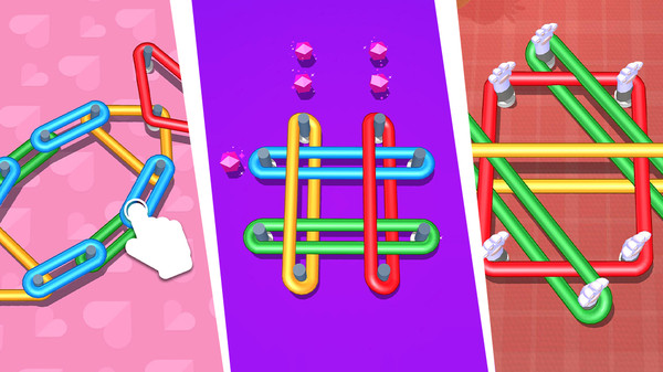 游戏中有众多关卡需要解决橡皮筋的问题,将不同颜色的橡皮筋按照不同的顺序将其全部解开,不同的解题思路带来非常丰富的游玩体验。在每一次的任务中观察橡皮筋的位置,快速完成更多的谜题,通过更多难关!