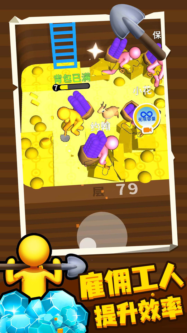 《挖土小能手》是一款魔性的放置经营类游戏,玩家需要扮演一名你宝藏寻找者,通过不断的挖掘你发现的目标地,寻找深埋在土中的宝藏,在游戏中,你可以通过货币雇佣工人协助你进行挖掘,提升你的挖掘效率,在挖掘地中你还可以挖掘到宝石、钻石等货币,可以帮助你去购买市场内的道具或者宠物! 游戏玩点: 1.有趣的玩法,方案众多等你决策 2.多样的元素设计,让游戏更具趣味性与挑战性 3.趣味的关卡设计,充满新奇的操作方式! 4.有趣的隐藏彩蛋,让你在游戏的探索过程中惊喜不断!
