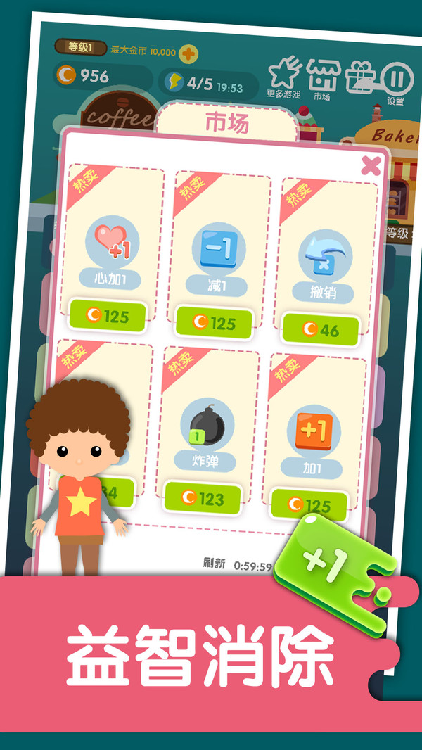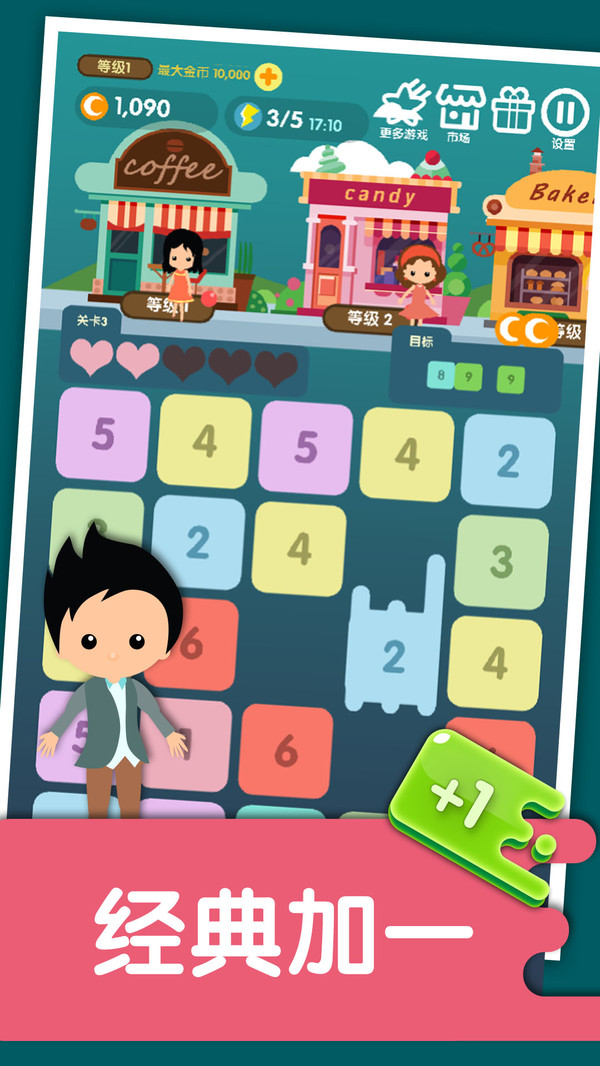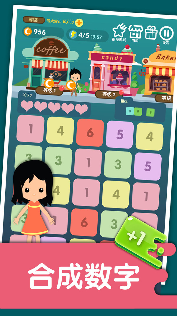 这是一款好玩简单的数字合体消除加经营商店的游戏,游戏中每次点击方块,可以使方块数字加一,三个相同的数字可以合成一个更大的数字,每次合成可以获得金币,使用金币购买或升级你的商店,吸引更多的顾客来你的商店街购物吧。